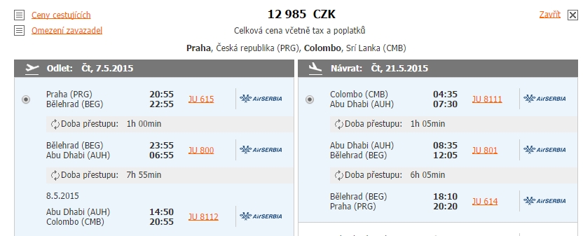 Rezervace: Praha – Colombo 12.985 Kč (pro vyhledání jiného termínu stačí kliknout na „změnit“)