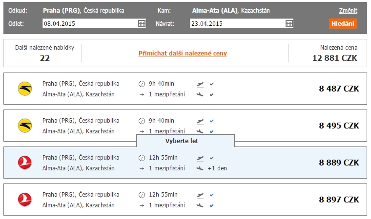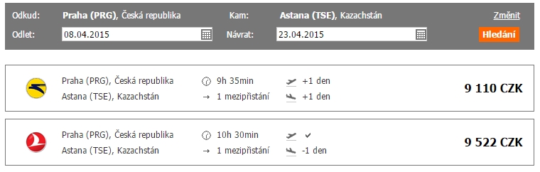 V případě Astany (TSE) se pak dostáváme na cenu 9.110 Kč s UIA a 9.522 Kč s Turkish Airlines.