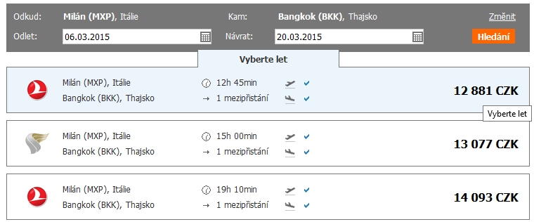 Příklad rezervace s Turkish z Milána v termínu od 6.3 do 20.3.2015: