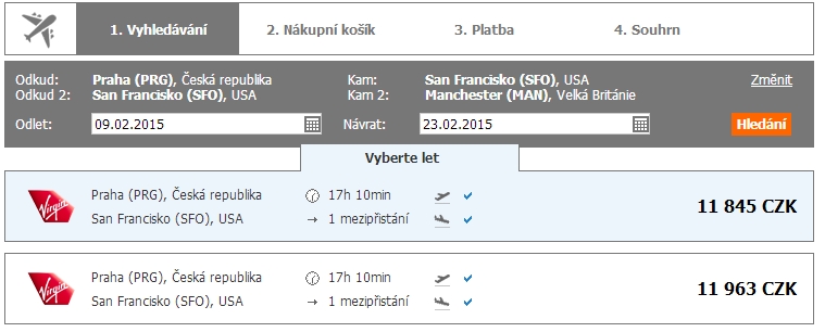 Zajímavou možností pro cestu do New Yorku a na západní pobřeží USA může být kombinovaný tarif společností British Airways a Virgin Atlantic. Například letenky na období listopad až duben 2015 můžete při odletu z Prahy (PRG) do San Francisca (SFO) s návratem do Manchesteru (MAN) koupit za velmi pěkných 11.845 Kč. Za podobné ceny lze vybrat letiště příletu v USA také New York (EWR) od 7.824 Kč při cestě z Varšavy a 10.832 Kč při odletu z Prahy. Pro návrat z Manchesteru můžete využít EasyJet nebo Jet2.com s cenou jednosměrné letenky okolo 1.000 Kč.